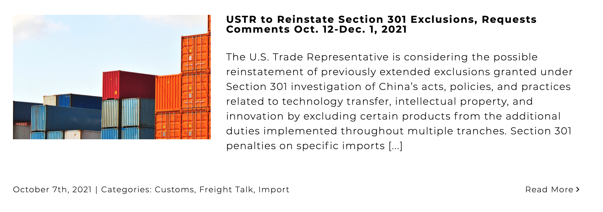 As reported last week and in light of the extreme impact of Section 301 to commercial goods from China, the Office of the United States Trade Representative (USTR) is requesting comments on whether to reinstate specific product exclusions. Public comment period will begin October 12, 2021 and remain open through December 1, 2021.