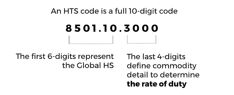 The Harmonized Tariff Schedule (HTS), also known as the Schedule A, is the United States import classification system. It is administered by the U.S. International Trade Commission. An HTS code is a full 10-digit code which utilizes the 6-digit headings and the subheadings from the WCO HS. The last four digits of the US HTS code are used to describe the product using specific commodity details (composition, material, function, etc.) which will define the rate of duty for the imported goods.