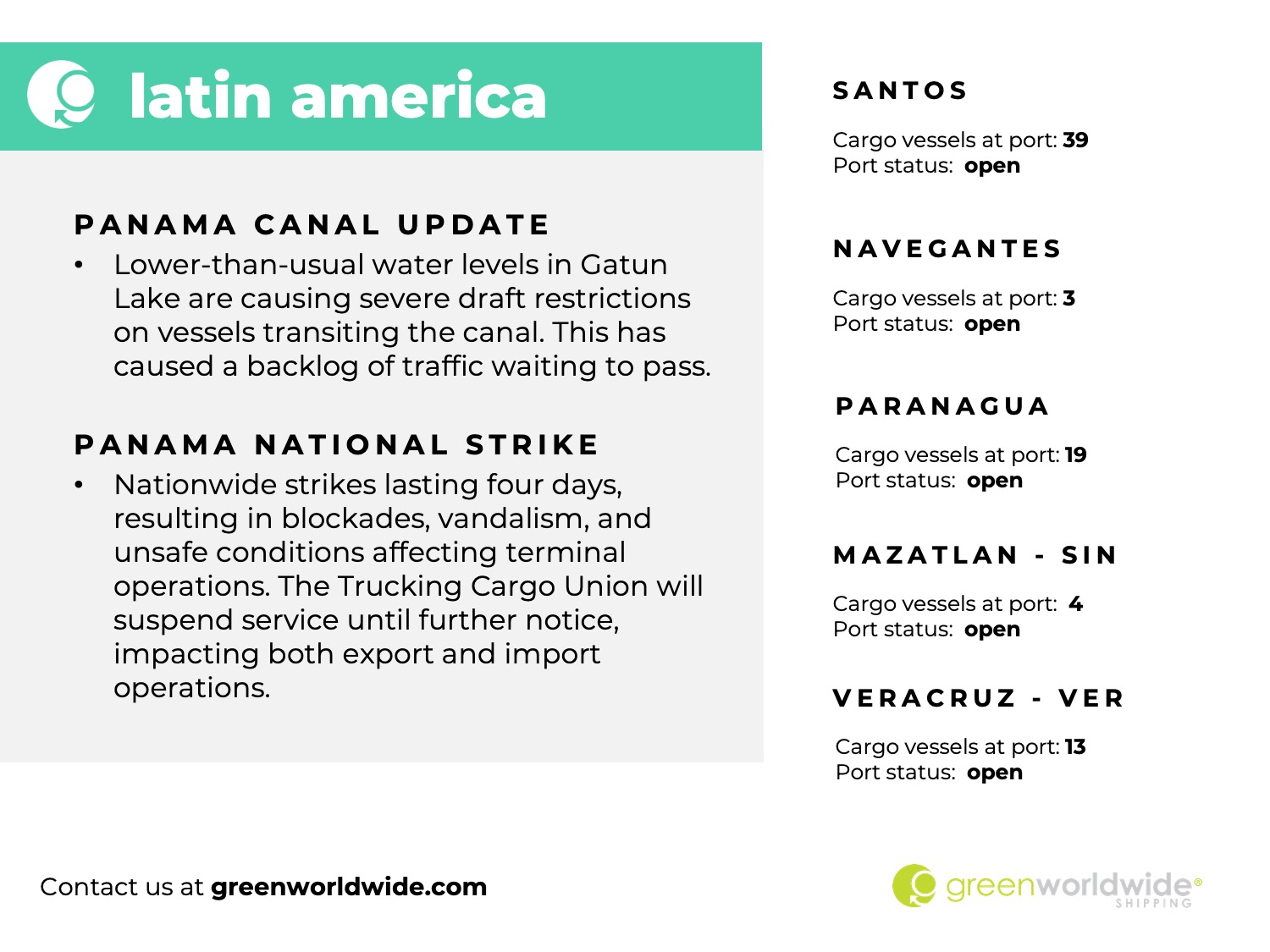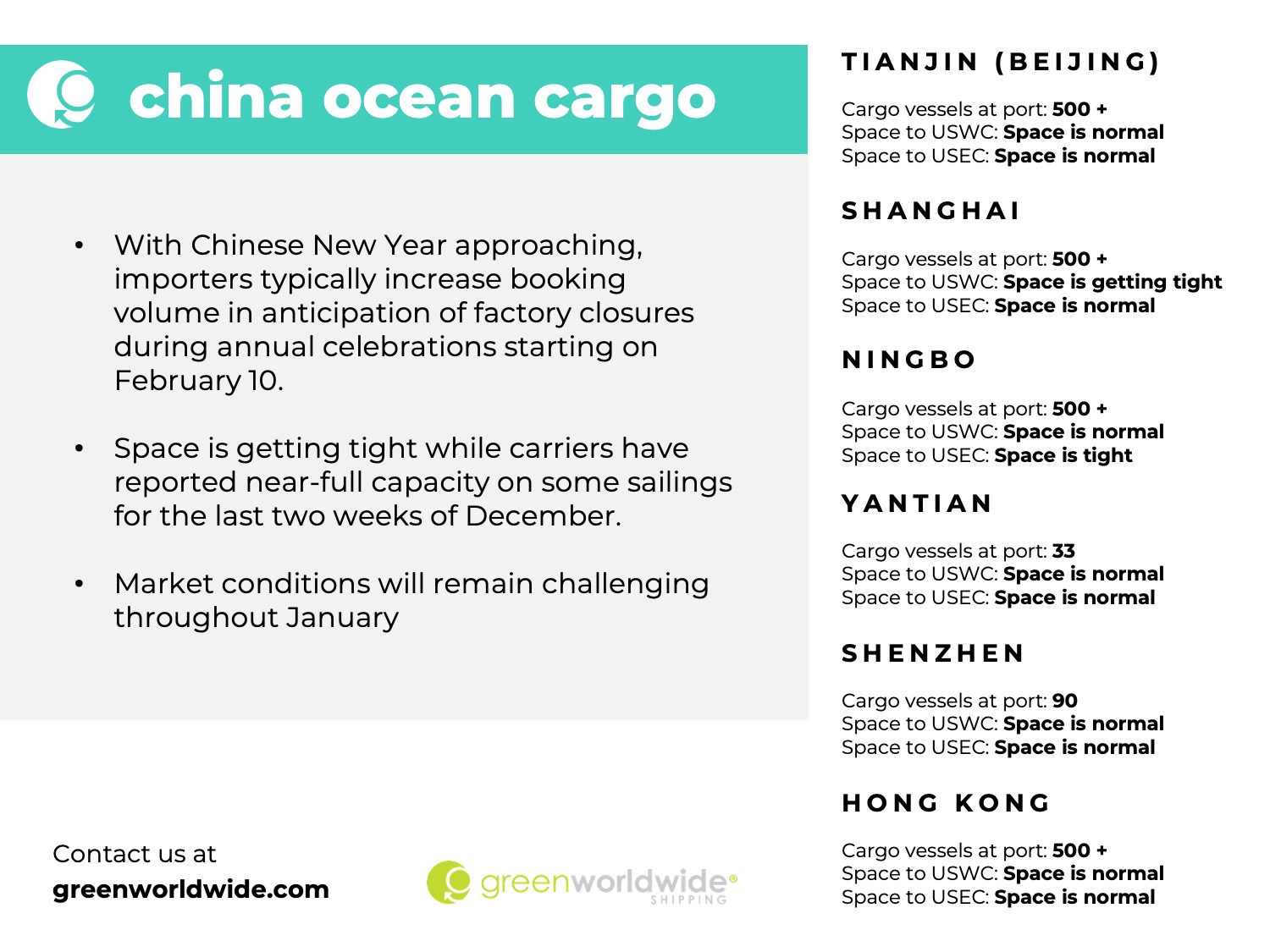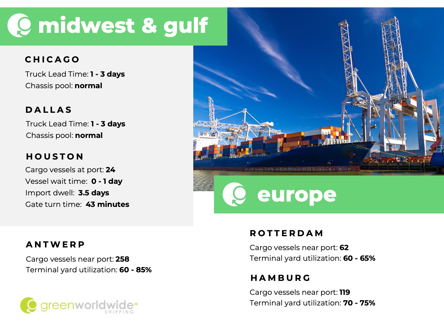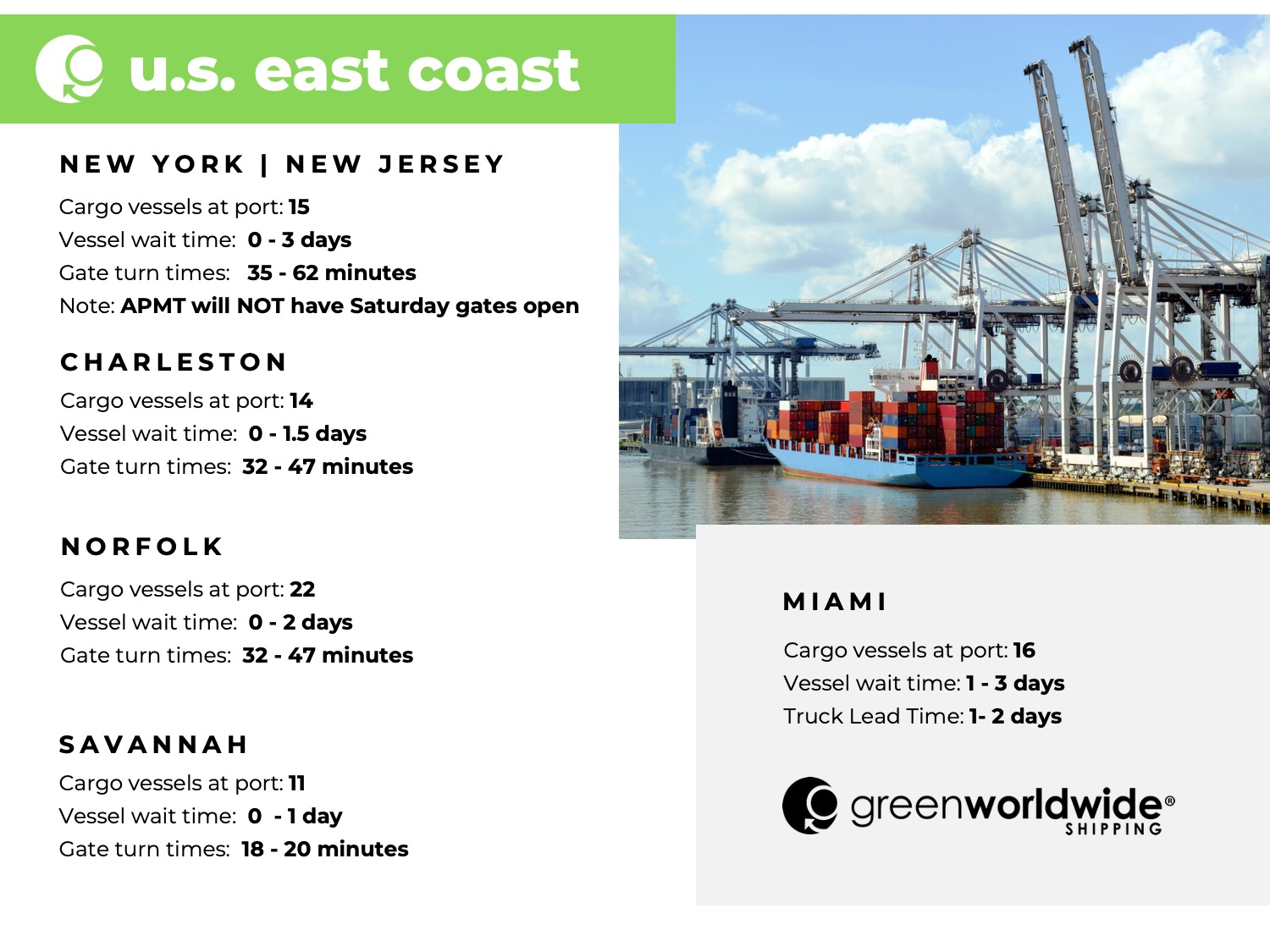 Green Worldwide Shipping’s Freight Market Update covers port information, import and export news, vessel wait time and cargo vessels at major ports & more. For continuous updates, make sure to check out our website at greenworldwide.com.