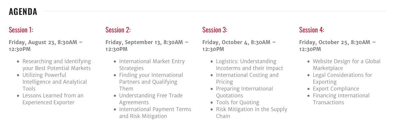 Companies accepted into the program will become skilled at finding profitable export markets, developing distribution channels, understanding foreign and U.S. regulatory issues, pricing and costing company products, submitting international quotations, processing accounts receivable and recognizing legal and cultural considerations.