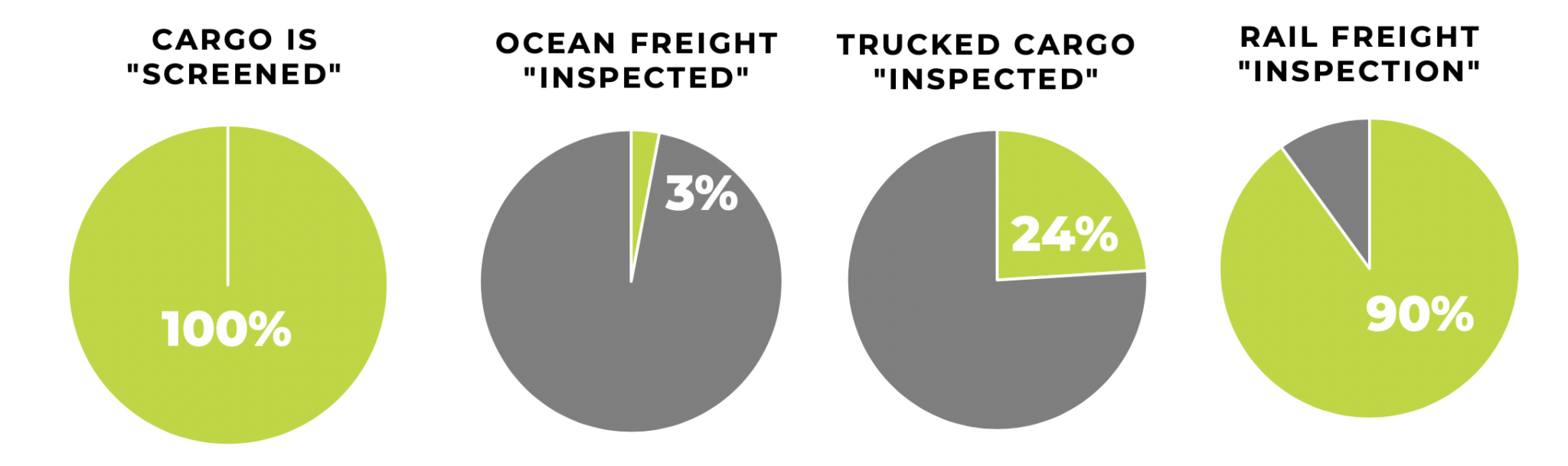 The U.S. receives over 25 million cargo containers annually equating to roughly 48 containers entering U.S. ports each minute. Over 11 million are received by ocean and truck respectively and 3 million by rail. One can imagine how physical inspection could overwhelm U.S. ports and bring the entry process to a stand-still. Of the total import to the U.S. 100% are screened, however, only 3% of ocean, 24% of truck and 90% of rail freight are actually physically inspected by Customs and Border Protection (CBP). While screening is a greater security risk than physical inspection, it is a significant tradeoff to ensuring the steady flow of freight.