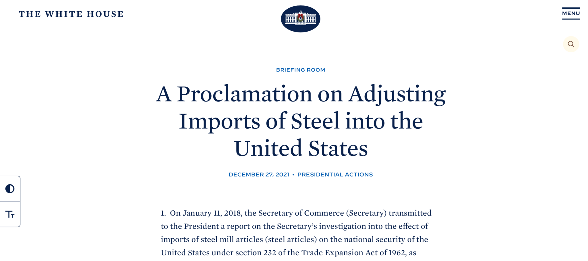 READ THE FULL WHITE HOUSE PROCLAMATION ON ADJUSTING IMPORTED OF STEEL INTO THE UNITED STATES